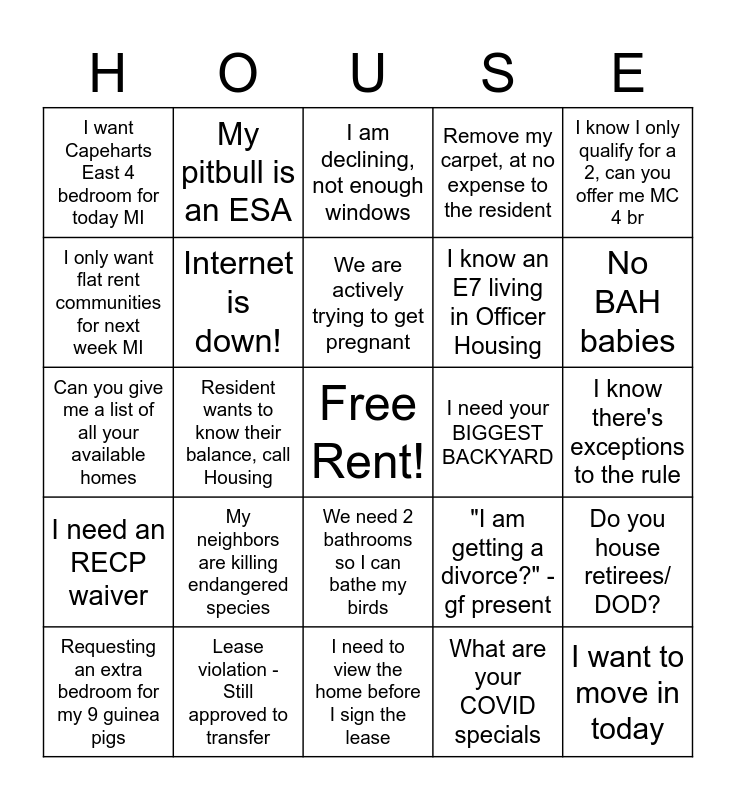 This bingo card has a free space and 44 words: Incorrect floorplan in Yardi, I want to move in today, I'm an E3 and want to live at Chesterton, Requesting an extra bedroom for my 9 guinea pigs, My fiance is my live in care provider, What are your COVID specials, I am declining, not enough windows, I want Silver Strand 1 on the Hot Sheet, I know I only qualify for a 2, can you offer me MC 4 br, Lease violation - Still approved to transfer, Remove my carpet, at no expense to the resident, I need your BIGGEST BACKYARD, We need 2 bathrooms so I can bathe my birds, My neighbors are killing endangered species, Are you open during Quarantine, I need to view the home before I sign the lease, I have plenty of offers in my email, Can you give me a list of all your available homes, Can I pay $1900 for Lofgren, No BAH babies, My pitbull is an ESA, My parents are moving in also, add them to the lease, I know I'm moving in tomorrow, but I'm divorcing, I want Capeharts East 4 bedroom for today MI, I am an E9 and am very happy with Santo, I know there's exceptions to the rule, Are you making this rule up, I was an AMAZING resident, "I am getting a divorce?" - gf present, I need an RECP waiver, Miramar should only be for Marines, Do you house retirees/ DOD?, CPEN never answers their phone, I haven't received my lease agreement, Resident wants to know their balance, call Housing, Can I have my 2 offers at the same time?, Can't you kick people out so I can move in, I want NAB 4 bedroom, We are actively trying to get pregnant, I only want flat rent communities for next week MI, I know an E7 living in Officer Housing, You forced me to accept and move in, Internet is down! and I will ONLY accept larger bedroom size homes.