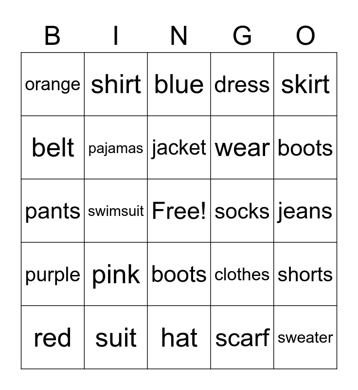 This bingo card has a free space and 27 words: clothes, shoes, wear, hat, belt, blue, shirt, purple, socks, shorts, pants, dress, red, suit, boots, green, pajamas, jacket, pink, orange, jeans, scarf, swimsuit, sweater, boots, skirt and coat.