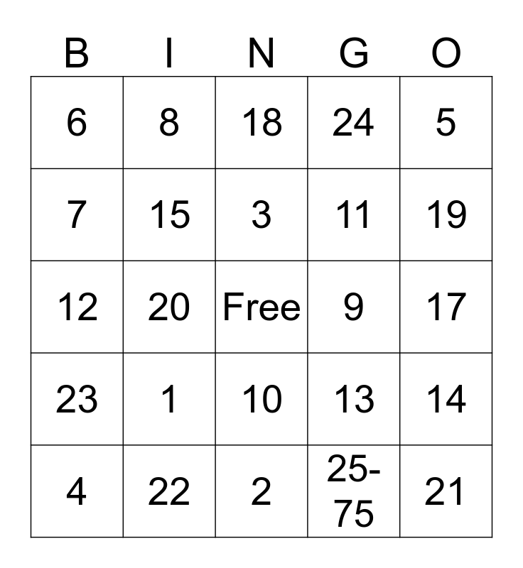 This bingo card has a free space and 25 words: 1, 2, 3, 4, 5, 6, 7, 8, 9, 10, 11, 12, 13, 14, 15, 16, 17, 18, 19, 20, 21, 22, 23, 24 and 25-75.