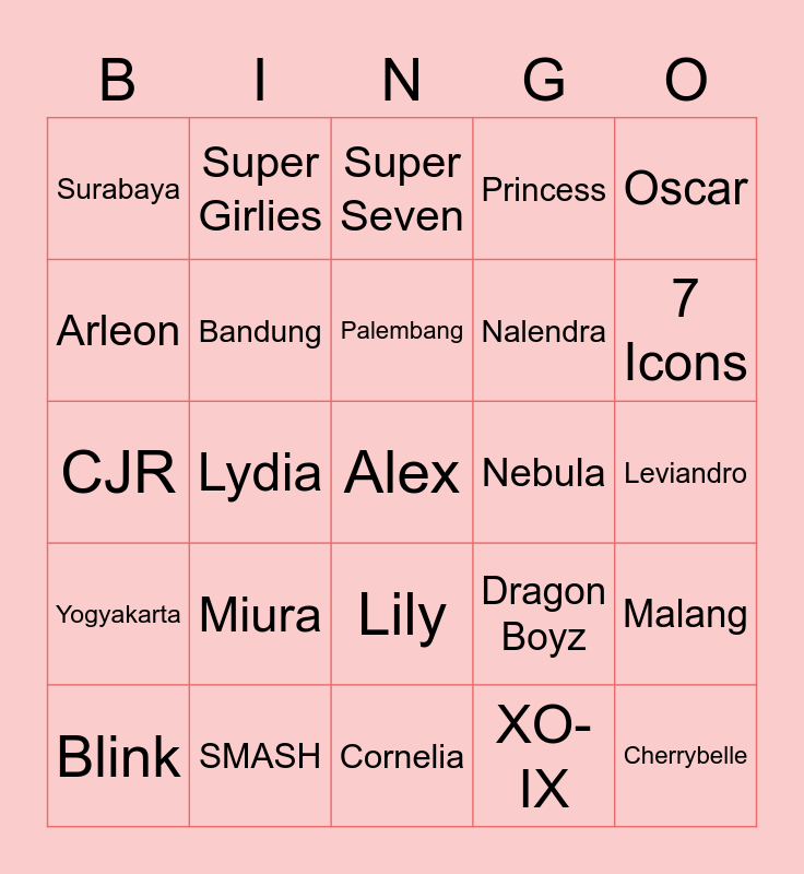 This bingo card has a free space and 24 words: Miura, SMASH, Palembang, Blink, Oscar, Surabaya, Arleon, Super Girlies, Nebula, Lily, Nalendra, CJR, Dragon Boyz, Malang, Bandung, XO-IX, Leviandro, Super Seven, 7 Icons, Lydia, Cherrybelle, Yogyakarta, Princess and Cornelia.
