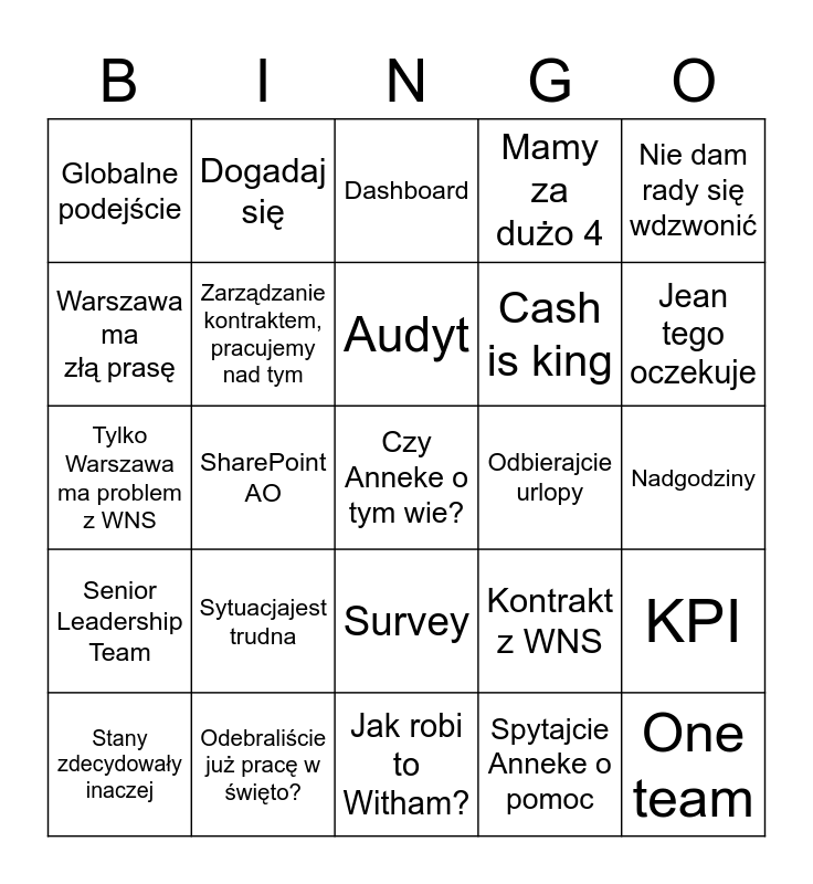 This bingo card has a free space and 24 words: Sytuacjajest trudna, Odebraliście już pracę w święto?, Audyt, Stany zdecydowały inaczej, Nie dam rady się wdzwonić, Globalne podejście, Warszawa ma złą prasę, Dogadaj się, Odbierajcie urlopy, Survey, Cash is king, Tylko Warszawa ma problem z WNS, Kontrakt z WNS, KPI, Zarządzanie kontraktem, pracujemy nad tym, Spytajcie Anneke o pomoc, Nadgodziny, Dashboard, Jean tego oczekuje, SharePoint AO, One team, Senior Leadership Team, Mamy za dużo 4 and Jak robi to Witham?.