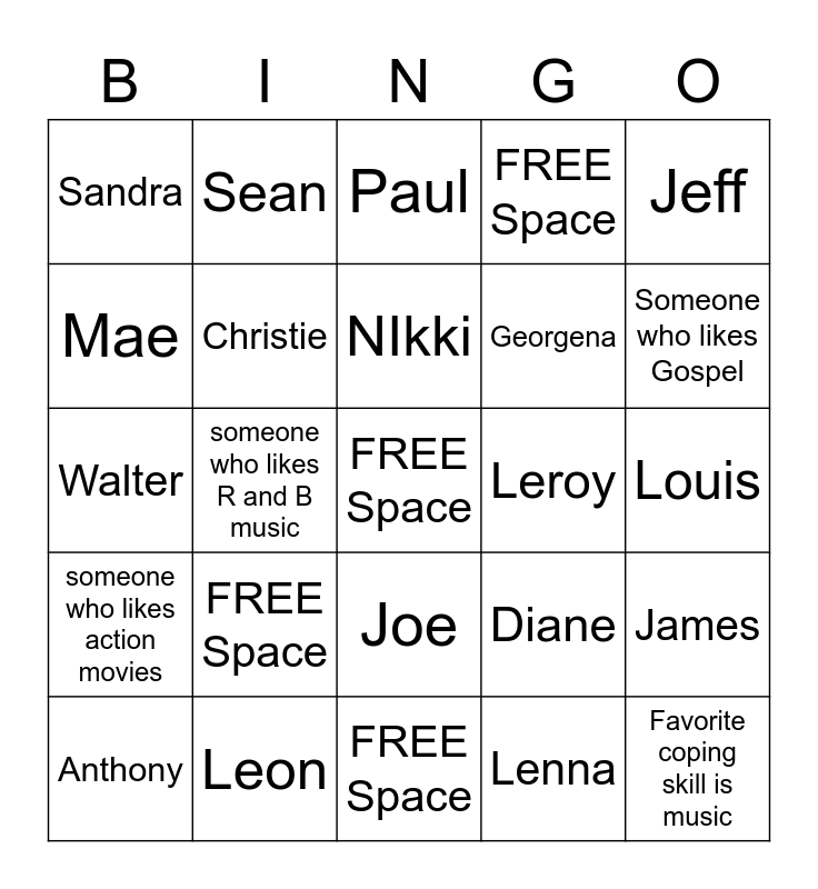 This bingo card has a free space and 24 words: FREE Space, Leon, NIkki, Anthony, Jeff, Sandra, Mae, Sean, Leroy, Joe, Georgena, Walter, Diane, James, Christie, Lenna, Louis, Paul, Someone who likes Gospel, someone who likes R and B music, Favorite coping skill is music, someone who likes action movies, FREE Space and FREE Space.
