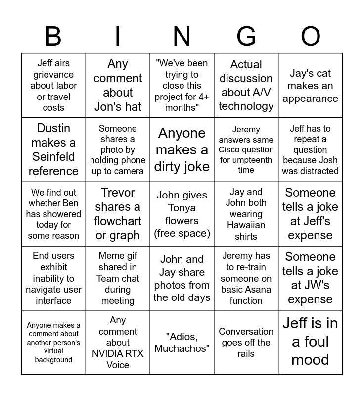 This bingo card has a free space and 24 words: Meme gif shared in Team chat during meeting, Any comment about NVIDIA RTX Voice, Anyone makes a dirty joke, Anyone makes a comment about another person's virtual background, Jay's cat makes an appearance, Jeff airs grievance about labor or travel costs, Dustin makes a Seinfeld reference, Any comment about Jon's hat, Jay and John both wearing Hawaiian shirts, John and Jay share photos from the old days, Jeremy answers same Cisco question for umpteenth time, We find out whether Ben has showered today for some reason, Jeremy has to re-train someone on basic Asana function, Someone tells a joke at JW's expense, Someone shares a photo by holding phone up to camera, Conversation goes off the rails, Someone tells a joke at Jeff's expense, "We've been trying to close this project for 4+ months", Jeff has to repeat a question because Josh was distracted, Trevor shares a flowchart or graph, Jeff is in a foul mood, End users exhibit inability to navigate user interface, Actual discussion about A/V technology and "Adios, Muchachos".