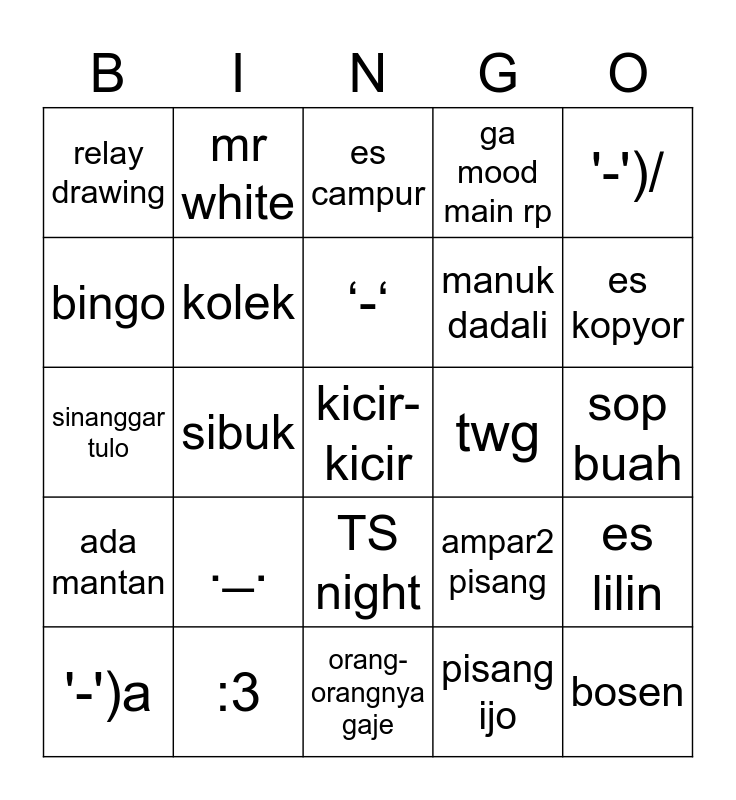 This bingo card has a free space and 24 words: ._., :3, ‘-‘, '-')a, '-')/, relay drawing, bingo, mr white, twg, TS night, manuk dadali, sinanggar tulo, ampar2 pisang, es lilin, kolek, pisang ijo, sop buah, es campur, es kopyor, sibuk, bosen, ada mantan, ga mood main rp and orang-orangnya gaje.