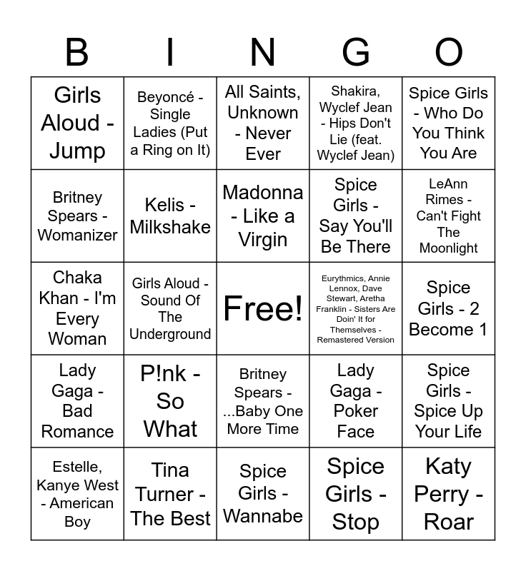 This bingo card has a free space and 50 words: Destiny's Child - Independent Women, Pt. 1 - Pasadena Remix, Katy Perry - Roar, Aretha Franklin - Respect, Spice Girls - Wannabe, P!nk - So What, Cyndi Lauper - Girls Just Want to Have Fun, Beyoncé - Single Ladies (Put a Ring on It), Little Mix - Wings, Britney Spears - Womanizer, Nelly Furtado - Maneater, Kelis - Milkshake, Shakira, Wyclef Jean - Hips Don't Lie (feat. Wyclef Jean), Spice Girls - Spice Up Your Life, Lady Gaga - Poker Face, Carly Rae Jepsen - Call Me Maybe, Donna Summer - She Works Hard For The Money, Madonna - Like a Virgin, Eurythmics, Annie Lennox, Dave Stewart, Aretha Franklin - Sisters Are Doin' It for Themselves - Remastered Version, Blondie - One Way Or Another - Remastered, Spice Girls - Who Do You Think You Are, Girls Aloud - Sound Of The Underground, Spice Girls - Stop, Girls Aloud - Jump, Spice Girls - Say You'll Be There, B*Witched - C'est La Vie, Girls Aloud - Love Machine, LeAnn Rimes - Can't Fight The Moonlight, Alesha Dixon - The Boy Does Nothing, All Saints, Unknown - Never Ever, Britney Spears - ...Baby One More Time, Billie Piper - Because We Want To, En Vogue - My Lovin' (You're Never Gonna Get It), Holly Valance - Kiss Kiss, Shania Twain - That Don't Impress Me Much, Tina Turner - The Best, En Vogue - Don't Let Go (Love), Stevie Nicks - Edge of Seventeen, Cher - If I Could Turn Back Time, Sugababes - Push The Button, Spice Girls - 2 Become 1, Girls Aloud - The Promise, The Pussycat Dolls - When I Grow Up, Spice Girls - Holler, Pixie Lott - Boys And Girls, Estelle, Kanye West - American Boy, Chaka Khan - I'm Every Woman, Whitney Houston - I Wanna Dance with Somebody (Who Loves Me), Whitney Houston - How Will I Know, Lady Gaga - Bad Romance and Jennifer Lopez - Waiting for Tonight.