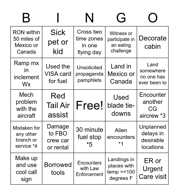 This bingo card has a free space and 52 words: TPax Audit, ER or Urgent Care visit, Unsolicited Weird or Strange stories told by strangers, Encounters with Law Enforcement, Damage to FBO crew car or rental, Major Appliance malfunction at home, Sick pet or kid, Ate seafood in a landlocked state, Ramp mx in inclement Wx, Forgot the acft fuel card, Used the VISA card for fuel, Unplanned delays in undesirable locations, Unplanned delays in desirable locations, Alien encounters *1, Transporting invasive plant or insect species to new locale, Ordered “Texas” sized food item *2, Unsolicited propaganda pamphlets, Used blade tie-downs, Used tow bar, Decorate cabin, Red Tail Air assist, Landings in places with temp >=100 degrees F, RON within 50 miles of Mexico or Canada, Land in Mexico or Canada, Broken A/C in hotel room, Hotel room change, Spilled drink on self, Used IFR alternate, Land somewhere no one has ever been to, Unforeseen crewmember swap/departure after commencing trip, Family member visit, Witness or participate in an eating challenge, Used lodging PLUS, Ground Speed >= 200 kts *2, Altitude >= 10,000’ DA, Cross two time zones in one flying day, Borrowed tools, Requested to divert for SAR, Comped a meal or beverage, Hotel room upgrade, Meet celebrity *2, Encounter another CG aircrew *3, Mistaken for any other branch or service *4, Make dad jokes with controller about being lost in the middle of the country, 30 minute fuel stop *5, Named weather event route deviation (e.g. Hurricane, TS, etc), Tweet problem with the aircraft, Mech problem with the aircraft, Forget or lose personal item, PEL, Make up and use cool call sign and Personal vehicle wont start on return home.