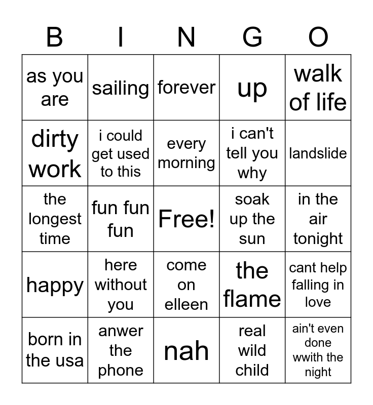 This bingo card has a free space and 24 words: here without you, anwer the phone, every morning, born in the usa, walk of life, as you are, dirty work, sailing, soak up the sun, come on elleen, i can't tell you why, the longest time, the flame, cant help falling in love, i could get used to this, real wild child, in the air tonight, forever, landslide, fun fun fun, ain't even done wwith the night, happy, up and nah.