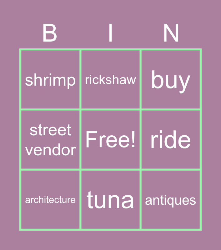 This bingo card has a free space and 14 words: canal, port, architecture, rickshaw, street vendor, antiques, souvenirs, exotic fruits, tuna, shrimp, eat, ride, buy and see.