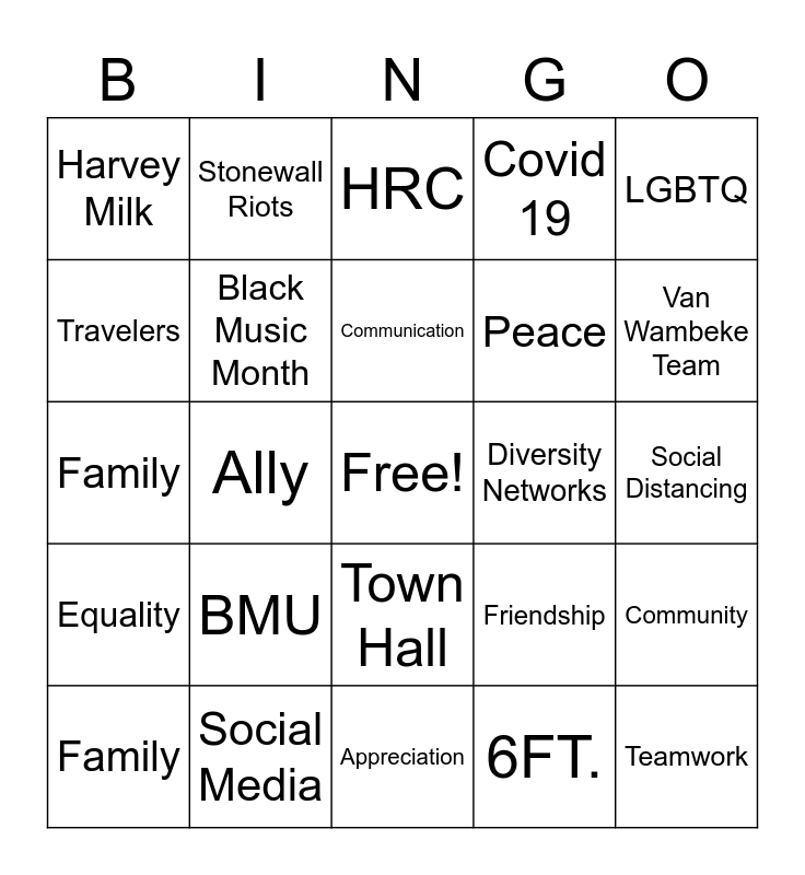 This bingo card has a free space and 24 words: BMU, Social Media, Communication, Family, LGBTQ, Harvey Milk, Travelers, Stonewall Riots, Diversity Networks, Town Hall, Peace, Family, Friendship, Community, Black Music Month, 6FT., Social Distancing, HRC, Van Wambeke Team, Ally, Teamwork, Equality, Covid 19 and Appreciation.