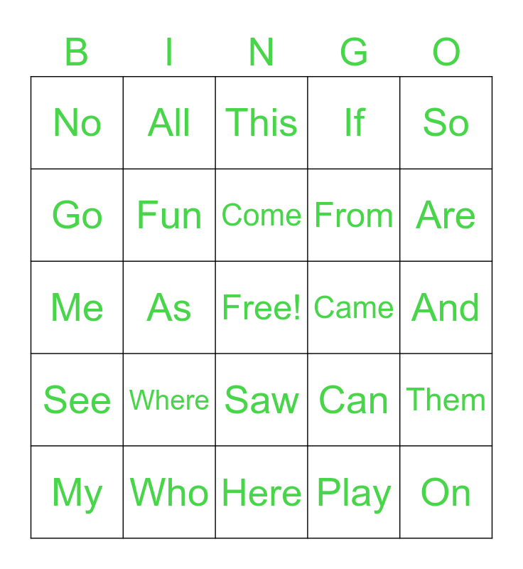 This bingo card has a free space and 24 words: Where, Who, Come, My, So, No, Go, All, Came, Saw, From, Me, Can, Them, Fun, Play, And, This, Are, As, On, See, If and Here.