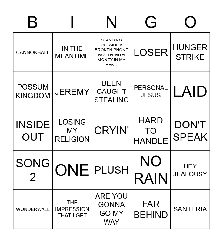 This bingo card has 39 words: 1979, ZOMBIE, UNDER THE BRIDGE, JEREMY, WONDERWALL, PLUSH, BEEN CAUGHT STEALING, BITTER SWEET SYMPHONY, HUNGER STRIKE, SONG 2, LOSING MY RELIGION, LOSER, CRYIN', DON'T SPEAK, HARD TO HANDLE, ONE, SAY IT AIN'T SO, CANNONBALL, WHEN I COME AROUND, NO RAIN, POSSUM KINGDOM, ARE YOU GONNA GO MY WAY, PERSONAL JESUS, LAID, TONIGHT, TONIGHT, GOOD, SANTERIA, SANTA MONICA, SHINE, IN THE MEANTIME, BETTER DAYS, RUNAWAY TRAIN, STANDING OUTSIDE A BROKEN PHONE BOOTH WITH MONEY IN MY HAND, THE IMPRESSION THAT I GET, FAR BEHIND, CRAZY, HEY JEALOUSY, INSIDE OUT and ONE HEADLIGHT.