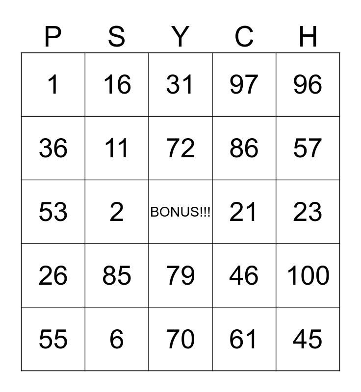 This bingo card has a free space and 24 words: 85, 6, 72, 55, 96, 1, 36, 16, 21, 79, 86, 53, 46, 100, 11, 61, 23, 31, 57, 2, 45, 26, 97 and 70.