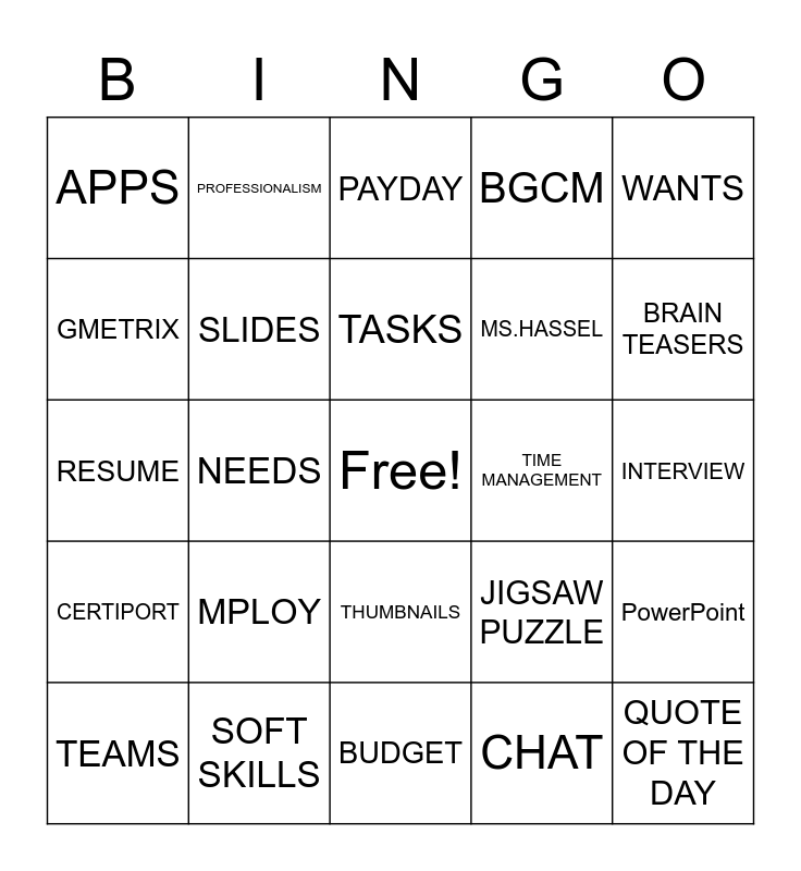 This bingo card has a free space and 24 words: MPLOY, SOFT SKILLS, TASKS, TEAMS, WANTS, APPS, GMETRIX, PROFESSIONALISM, TIME MANAGEMENT, THUMBNAILS, MS.HASSEL, RESUME, JIGSAW PUZZLE, PowerPoint, SLIDES, CHAT, INTERVIEW, PAYDAY, BRAIN TEASERS, NEEDS, QUOTE OF THE DAY, CERTIPORT, BGCM and BUDGET.