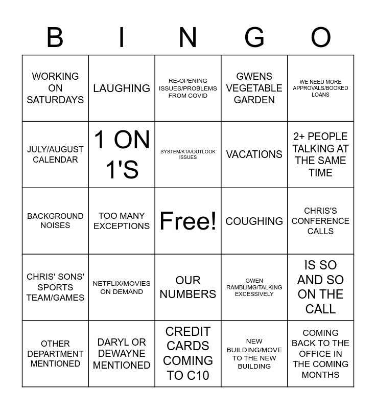 This bingo card has a free space and 24 words: NETFLIX/MOVIES ON DEMAND, DARYL OR DEWAYNE MENTIONED, SYSTEM/KTA/OUTLOOK ISSUES, OTHER DEPARTMENT MENTIONED, WE NEED MORE APPROVALS/BOOKED LOANS, WORKING ON SATURDAYS, JULY/AUGUST CALENDAR, LAUGHING, COUGHING, OUR NUMBERS, VACATIONS, BACKGROUND NOISES, GWEN RAMBLIMG/TALKING EXCESSIVELY, IS SO AND SO ON THE CALL, 1 ON 1'S, NEW BUILDING/MOVE TO THE NEW BUILDING, CHRIS'S CONFERENCE CALLS, RE-OPENING ISSUES/PROBLEMS FROM COVID, 2+ PEOPLE TALKING AT THE SAME TIME, TOO MANY EXCEPTIONS, COMING BACK TO THE OFFICE IN THE COMING MONTHS, CHRIS' SONS' SPORTS TEAM/GAMES, GWENS VEGETABLE GARDEN and CREDIT CARDS COMING TO C10.