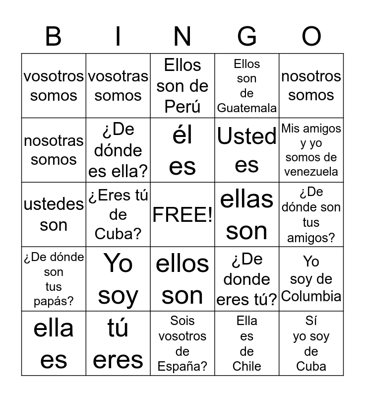 This bingo card has a free space and 24 words: Yo soy, tú eres, él es, ella es, nosotros somos, vosotros somos, nosotras somos, vosotras somos, ellas son, ellos son, Usted es, ustedes son, ¿De donde eres tú?, Yo soy de Columbia, ¿De dónde es ella?, Ella es de Chile, ¿De dónde son tus amigos?, Ellos son de Perú, Mis amigos y yo somos de venezuela, ¿Eres tú de Cuba?, Sí yo soy de Cuba, ¿De dónde son tus papás?, Ellos son de Guatemala and Sois vosotros de España?.