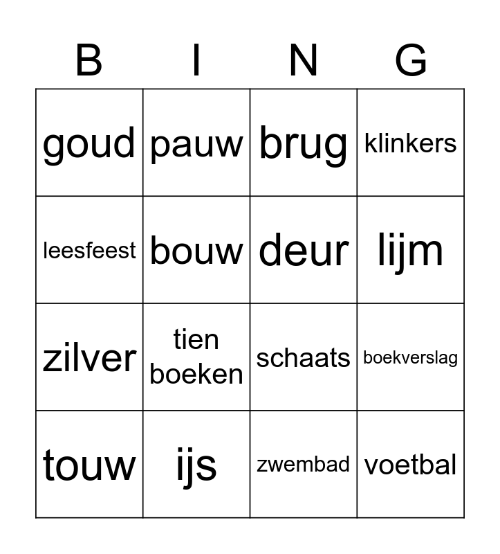 This bingo card has 52 words: oud, touw, bloem, koek, muis, fruit, pauw, blauw, bouw, touw, deur, neus, ziek, niet, druif, boek, lijm, ijs, trein, leesfeest, boekverslag, boekenlegger, goud, zilver, zoem, veilig leren lezen, voorlezen, leesplankje, tien boeken, diploma, lezen is leuk, klinkers, medeklinkers, prijs, sport, brug, hoepel, appeltje, duiken, tennis, badpak, zwembad, voetbal, honk, dank, rijden, auto, schaats, informatieboek, prentenboek, voorleesboek and veilig en vlot.