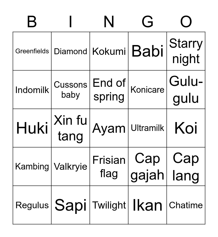 This bingo card has 25 words: Valkryie, Twilight, End of spring, Regulus, Starry night, Greenfields, Indomilk, Diamond, Ultramilk, Frisian flag, Konicare, Huki, Cap gajah, Cap lang, Cussons baby, Chatime, Koi, Kokumi, Gulu-gulu, Xin fu tang, Ayam, Sapi, Kambing, Babi and Ikan.