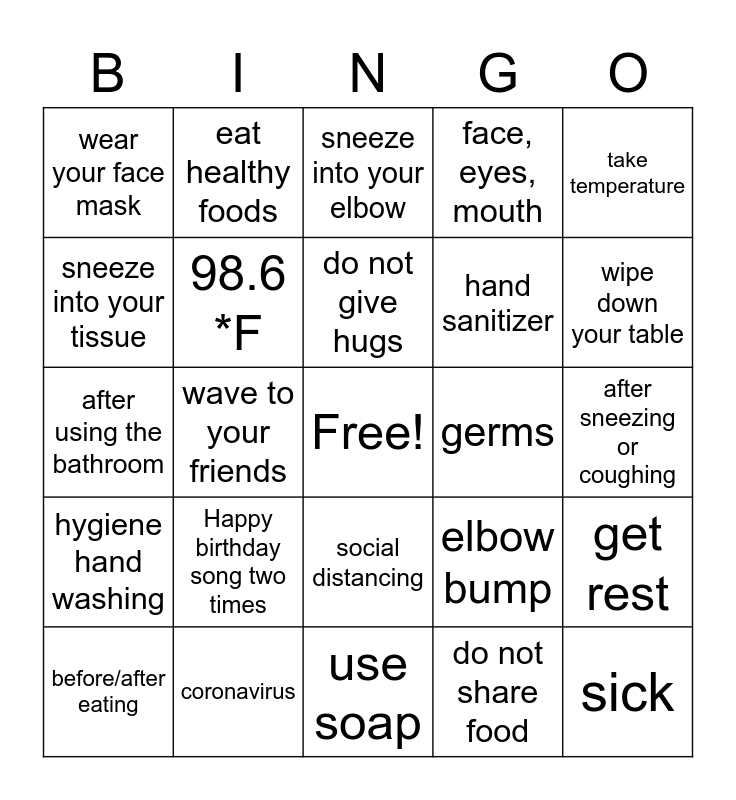 This bingo card has a free space and 24 words: Happy birthday song two times, coronavirus, do not give hugs, before/after eating, take temperature, wear your face mask, sneeze into your tissue, eat healthy foods, germs, social distancing, hand sanitizer, after using the bathroom, elbow bump, get rest, 98.6 *F, do not share food, after sneezing or coughing, sneeze into your elbow, wipe down your table, wave to your friends, sick, hygiene hand washing, face, eyes, mouth and use soap.