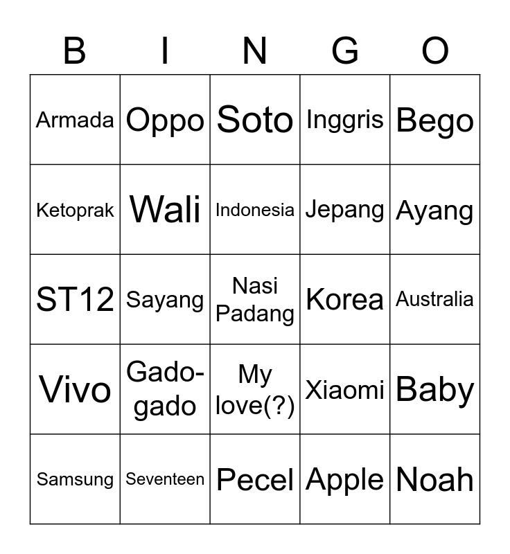 This bingo card has a free space and 24 words: Gado-gado, Seventeen, Indonesia, Samsung, Bego, Armada, Ketoprak, Oppo, Korea, My love(?), Jepang, ST12, Xiaomi, Baby, Wali, Apple, Australia, Soto, Ayang, Sayang, Noah, Vivo, Inggris and Pecel.