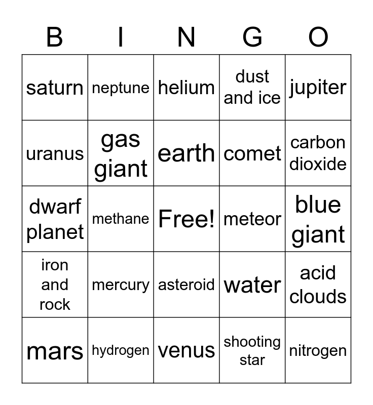 This bingo card has a free space and 25 words: mercury, venus, earth, mars, jupiter, saturn, uranus, neptune, meteor, asteroid, comet, dwarf planet, water, acid clouds, gas giant, terrestrial planet, blue giant, helium, carbon dioxide, methane, nitrogen, hydrogen, iron and rock, dust and ice and shooting star.