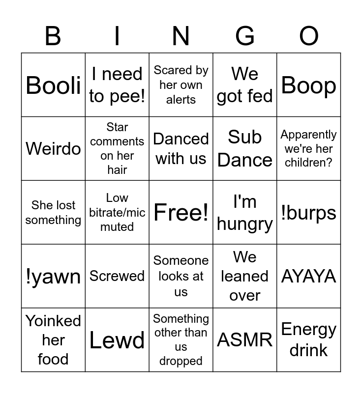 This bingo card has a free space and 26 words: Someone looks at us, ASMR, Danced with us, Lewd, Boop, Booli, Weirdo, I need to pee!, !burps, We leaned over, Sub Dance, She lost something, AYAYA, Yoinked her food, Low bitrate/mic muted, !burps, We got fed, !yawn, Scared by her own alerts, Energy drink, Apparently we're her children?, Something other than us dropped, I'm hungry, Screwed, Star comments on her hair and Kanpai!.