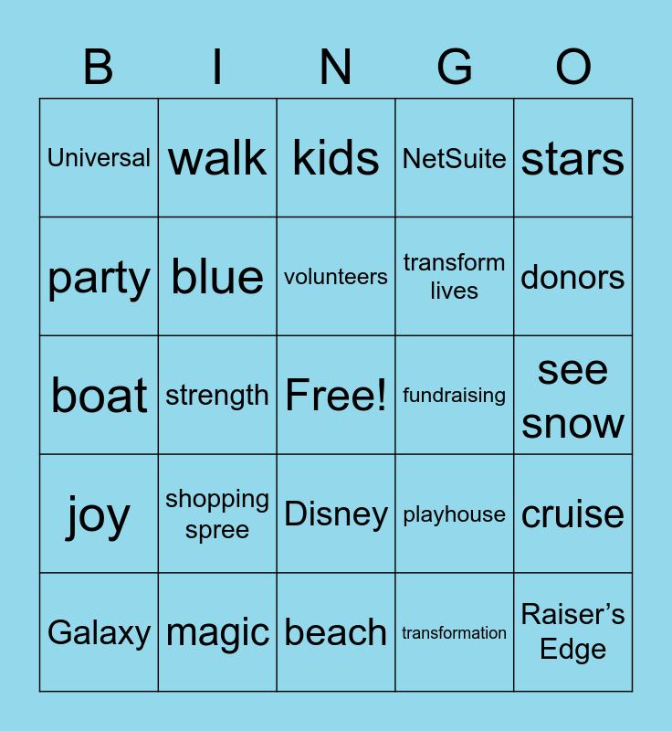 This bingo card has a free space and 33 words: wish, family, strength, hope, joy, blue, stars, Galaxy, walk, Gala, volunteers, kids, smiles, events, fundraising, donors, magic, boat, shopping spree, playhouse, Disney, SeaWorld, Universal, see snow, beach, Raiser’s Edge, NetSuite, transform lives, party, cruise, empower, transformation and community.