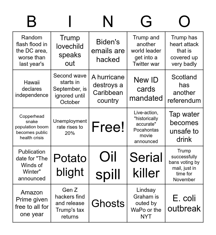 This bingo card has a free space and 24 words: Potato blight, Gen Z hackers find and release Trump's tax returns, A hurricane destroys a Caribbean country, Amazon Prime given free to all for one year, Trump has heart attack that is covered up very badly, Random flash flood in the DC area, worse than last year's, Hawaii declares independence, Trump lovechild speaks out, Live-action, "historically accurate" Pocahontas movie announced, Oil spill, New ID cards mandated, Copperhead snake population boom becomes public health crisis, Serial killer, Trump successfully bans voting by mail, just in time for November, Second wave starts in September, is ignored until October, Lindsay Graham is outed by WaPo or the NYT, Tap water becomes unsafe to drink, Biden's emails are hacked, Scotland has another referendum, Unemployment rate rises to 20%, E. coli outbreak, Publication date for "The Winds of Winter" announced, Trump and another world leader get into a Twitter war and Ghosts.