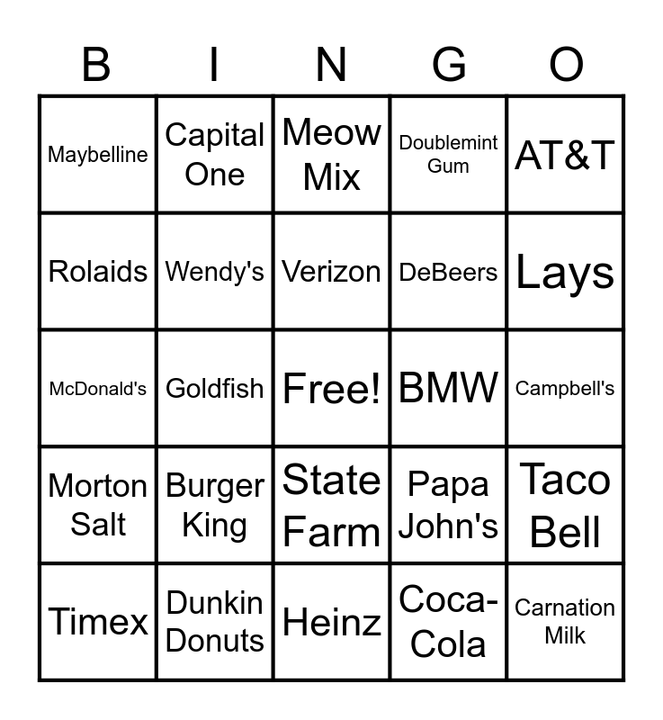 This bingo card has a free space and 34 words: Nike, Coca-Cola, Maxwell House, Wheaties, Morton Salt, Wendy's, AT&T, Timex, Capital One, M&M, Verizon, Meow Mix, Bounty, Charmin, BMW, Lays, Dunkin Donuts, McDonald's, Burger King, Papa John's, State Farm, Marines, Maybelline, Campbell's, Heinz, Carnation Milk, Doublemint Gum, Alka Seltzer, DeBeers, Rolaids, Energizer, Goldfish, Taco Bell and Mountain Dew.