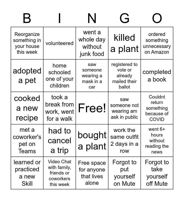 This bingo card has a free space and 29 words: Used hand sanitizer today, Video Chat with family, friends or coworkers this week, went a whole day without junk food, went a whole day without alcohol, ordered something unnecessary on Amazon, Reorganize something in your house this week, home schooled one of your children, saw someone wearing a mask in a car, saw someone not wearing am ask in public, went 6+ hours without reading the news, learned or practiced a new Skill, took a break from work, went for a walk, Forgot to put yourself on Mute, Forgot to take yourself off Mute, cooked a new recipe, ordered delivery, Free space for anyone that lives alone, work the same outfit 2 days in a row, completed a book, met a coworker's pet on Teams, had to cancel a trip, started a new netflix series, registered to vote or already mailed their ballot, Couldnt return something because of COVID, adopted a pet, volunteered, bought a plant, killed a plant and gained weight.