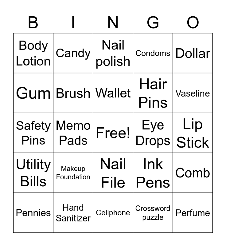 This bingo card has a free space and 24 words: Makeup Foundation, Hand Sanitizer, Wallet, Pennies, Dollar, Body Lotion, Gum, Candy, Eye Drops, Nail File, Hair Pins, Safety Pins, Ink Pens, Comb, Brush, Crossword puzzle, Lip Stick, Nail polish, Vaseline, Memo Pads, Perfume, Utility Bills, Condoms and Cellphone.