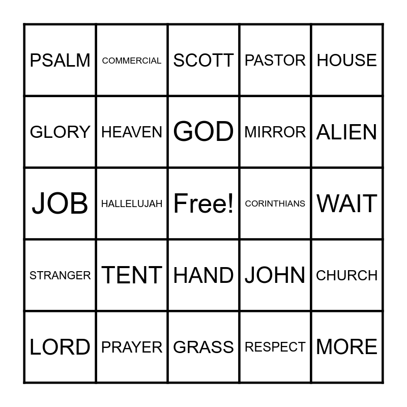 This bingo card has a free space and 30 words: PRAYER, BIBLE, HALLELUJAH, ABLE, PSALM, SCOTT, HEAVEN, HAND, CORINTHIANS, GRASS, WAIT, MORE, RESPECT, IMAGINE, ALIEN, PHILLIPIANS, JOHN, STRANGER, TENT, HOUSE, JOB, TROUBLE, COMMERCIAL, MIRROR, GLORY, PASTOR, CHURCH, LORD, GOD and DAD.
