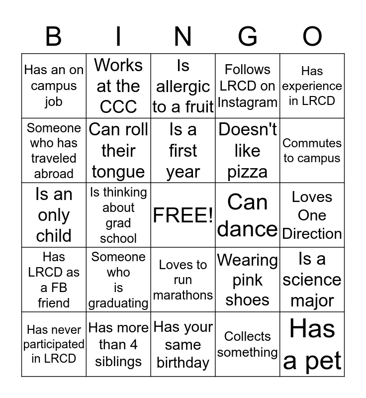 This bingo card has a free space and 24 words: Someone who is graduating, Has more than 4 siblings, Is a first year, Has never participated in LRCD, Has experience in LRCD, Has an on campus job, Someone who has traveled abroad, Works at the CCC, Can dance, Loves to run marathons, Doesn't like pizza, Is an only child, Wearing pink shoes, Is a science major, Can roll their tongue, Collects something, Loves One Direction, Is allergic to a fruit, Commutes to campus, Is thinking about grad school, Has a pet, Has LRCD as a FB friend, Follows LRCD on Instagram and Has your same birthday.