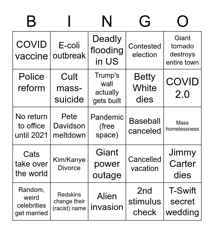 This bingo card has a free space and 24 words: Kim/Kanye Divorce, Redskins change their (racist) name, Trump's wall actually gets built, Random, weird celebrities get married, Giant tornado destroys entire town, COVID vaccine, Police reform, E-coli outbreak, Baseball canceled, Giant power outage, Betty White dies, No return to office until 2021, Cancelled vacation, Jimmy Carter dies, Cult mass-suicide, 2nd stimulus check, Mass homelessness, Deadly flooding in US, COVID 2.0, Pete Davidson meltdown, T-Swift secret wedding, Cats take over the world, Contested election and Alien invasion.