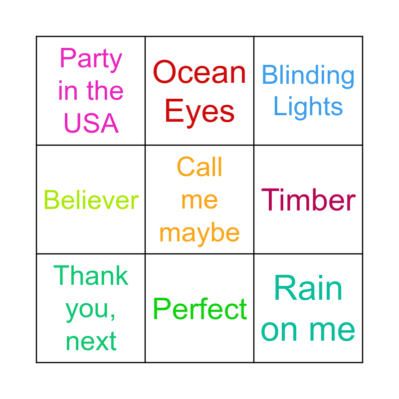 This bingo card has 12 words: Old Town Road, Rain on me, Call me maybe, Timber, Ocean Eyes, Blinding Lights, Perfect, Physical, Party in the USA, Believer, Thank you, next and I'm a Mess.