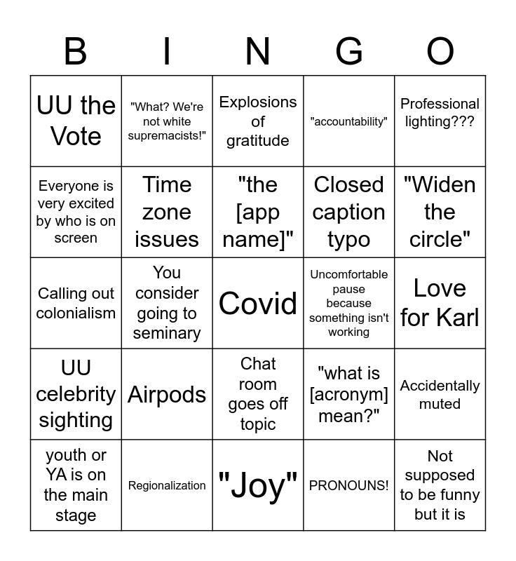 This bingo card has a free space and 24 words: Airpods, Regionalization, "the [app name]", youth or YA is on the main stage, Professional lighting???, UU the Vote, Everyone is very excited by who is on screen, "What? We're not white supremacists!", Uncomfortable pause because something isn't working, Chat room goes off topic, Closed caption typo, Calling out colonialism, "what is [acronym] mean?", Accidentally muted, Time zone issues, PRONOUNS!, Love for Karl, Explosions of gratitude, "Widen the circle", You consider going to seminary, Not supposed to be funny but it is, UU celebrity sighting, "accountability" and "Joy".