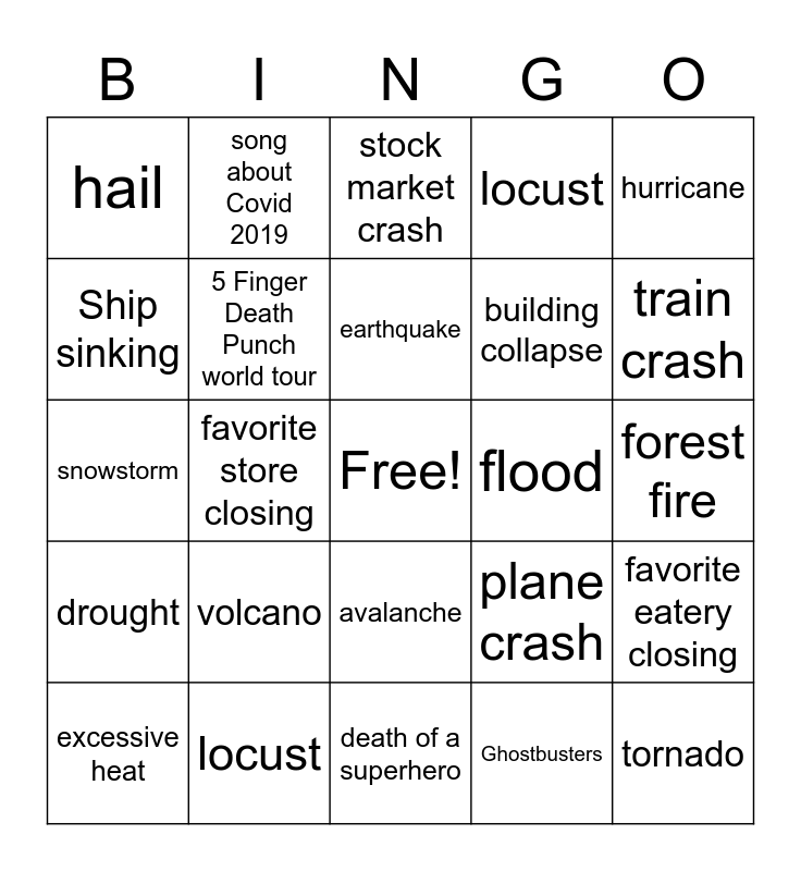 This bingo card has a free space and 34 words: Stay Puff Marshmallow Man saves the day, Ghostbusters, birds overtake the city, tsunami, drought, 5 Finger Death Punch world tour, hurricane, excessive heat, song about Covid 2019, movie about Covid 2019, earthquake, stock market crash, massive power loss, mud slide, flood, train crash, locust, snowstorm, volcano, plane crash, avalanche, pregnancy of a family member, hail, forest fire, death of a superhero, tornado, locust, murder hornets, building collapse, Ship sinking, Asian Lady Beetles, favorite store closing, favorite eatery closing and mad cow disease.