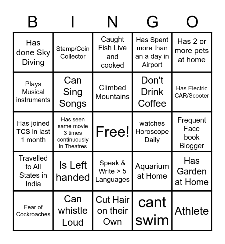 This bingo card has a free space and 24 words: Fear of Cockroaches, Is Left handed, Climbed Mountains, cant swim, Has 2 or more pets at home, Has done Sky Diving, Stamp/Coin Collector, Caught Fish Live and cooked, watches Horoscope Daily, Frequent Face book Blogger, Has joined TCS in last 1 month, Can Sing Songs, Aquarium at Home, Has Garden at Home, Plays Musical instruments, Can whistle Loud, Cut Hair on their Own, Has Spent more than an a day in Airport, Has Electric CAR/Scooter, Travelled to All States in India, Has seen same movie 3 times continuously in Theatres, Speak & Write > 5 Languages, Don't Drink Coffee and Athlete.