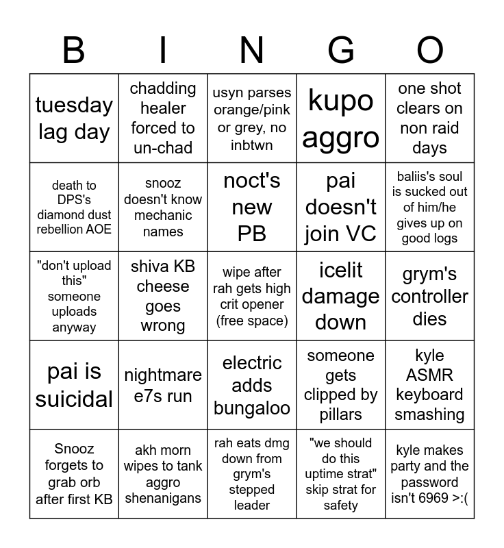 This bingo card has a free space and 24 words: nightmare e7s run, akh morn wipes to tank aggro shenanigans, noct's new PB, Snooz forgets to grab orb after first KB, one shot clears on non raid days, tuesday lag day, death to DPS's diamond dust rebellion AOE, chadding healer forced to un-chad, icelit damage down, electric adds bungaloo, pai doesn't join VC, "don't upload this" someone uploads anyway, someone gets clipped by pillars, kyle ASMR keyboard smashing, snooz doesn't know mechanic names, "we should do this uptime strat" skip strat for safety, grym's controller dies, usyn parses orange/pink or grey, no inbtwn, baliis's soul is sucked out of him/he gives up on good logs, shiva KB cheese goes wrong, kyle makes party and the password isn't 6969 >:(, pai is suicidal, kupo aggro and rah eats dmg down from grym's stepped leader.