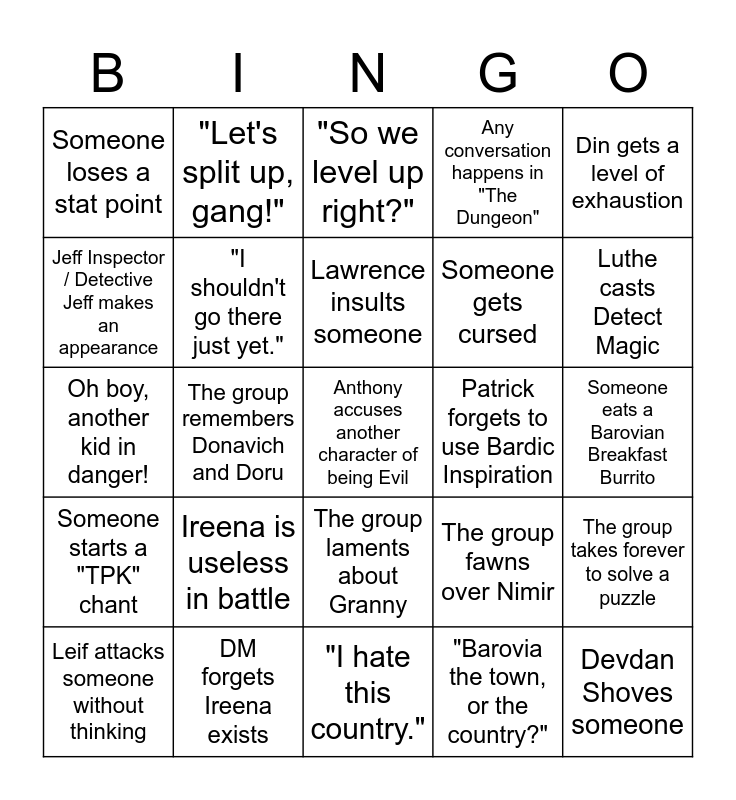 This bingo card has a free space and 24 words: Ireena is useless in battle, DM forgets Ireena exists, Lawrence insults someone, Leif attacks someone without thinking, Din gets a level of exhaustion, Someone loses a stat point, Jeff Inspector / Detective Jeff makes an appearance, "Let's split up, gang!", Patrick forgets to use Bardic Inspiration, The group laments about Granny, Someone gets cursed, Oh boy, another kid in danger!, The group fawns over Nimir, The group takes forever to solve a puzzle, "I shouldn't go there just yet.", "Barovia the town, or the country?", Someone eats a Barovian Breakfast Burrito, "So we level up right?", Luthe casts Detect Magic, The group remembers Donavich and Doru, Devdan Shoves someone, Someone starts a "TPK" chant, Any conversation happens in "The Dungeon" and "I hate this country.".