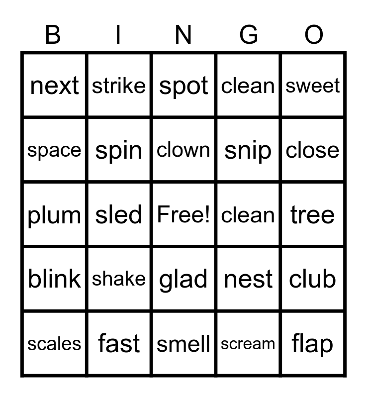 This bingo card has a free space and 29 words: scales, flag, sled, jump, next, spot, spin, shake, clean, fast, tree, flap, smell, scream, close, clap, glad, blink, sweet, plum, nest, leap, snip, space, clean, strike, club, clown and cave.