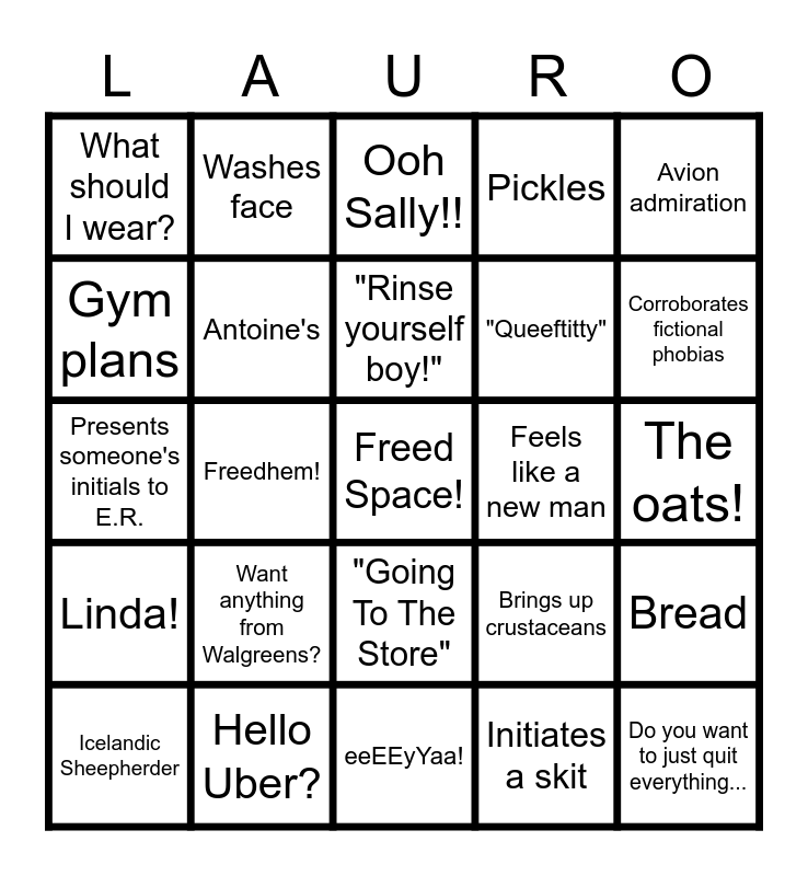 This bingo card has a free space and 49 words: Rejects Pep, Do you want to just quit everything..., Salmon?, eeEEyYaa!, Want anything from Walgreens?, Can't resist Lu, Washes face, Flossing, Gym plans, Tom Landry, Antoine's, Pickles, Bread, Brings up crustaceans, Imitates Lu, Calls a cat by a nickname, "Rinse yourself boy!", Feels like a new man, Desires/ admires plants, Avion admiration, Freedhem!, Initiates a skit, What should I wear?, "Queeftitty", Fight me!, Corroborates fictional phobias, Icelandic Sheepherder, Dances to rice cooker jingle, "Going To The Store", Linda!, Son!, But Pa!, Takes cat photo, Hhrrr!!, Hello Uber?, Desires new hairstyle, 8yo Feminist Me, MoOomin!, The oats!, Snail/ Slug appreciation, Browses Air B&B, Tips = "farmers market $$", Seasonal Fruit, Mola mola, Presents someone's initials to E.R., Ooh Sally!!, Salmon skin, Snoozes 15 alarms and Botulism!.