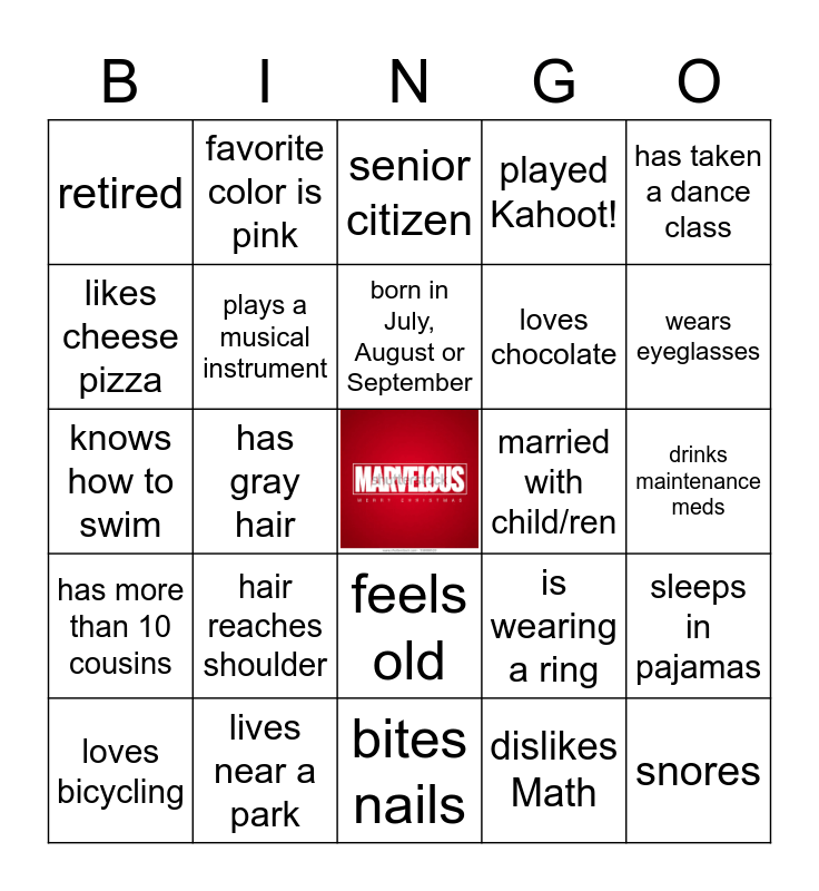 This bingo card has a free space and 34 words: can speak another language, dislikes Math, been to Boracay, been to Europe, has more than 10 cousins, plays a musical instrument, has taken a dance class, loves bicycling, favorite color is pink, allergic to seafood, born in July, August or September, senior citizen, has more than 2 siblings, lives outside the Philippines, married with child/ren, wears eyeglasses, lives near a park, knows how to swim, hair reaches shoulder, is wearing a ring, feels old, owns an air fryer, retired, drinks maintenance meds, bites nails, snores, played Kahoot!, athlete in school, loves chocolate, likes cheese pizza, went to an exclusive girl/boy school, has gray hair, sleeps in pajamas and has a green thumb.