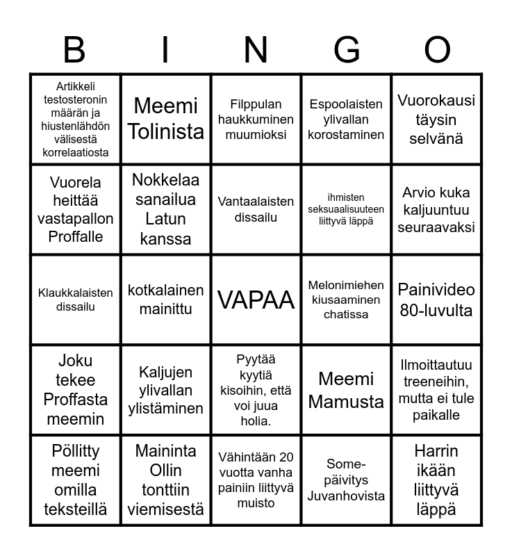 This bingo card has a free space and 24 words: Pöllitty meemi omilla teksteillä, Kaljujen ylivallan ylistäminen, Vantaalaisten dissailu, Some-päivitys Juvanhovista, Vuorokausi täysin selvänä, Artikkeli testosteronin määrän ja hiustenlähdön välisestä korrelaatiosta, Meemi Tolinista, Filppulan haukkuminen muumioksi, Melonimiehen kiusaaminen chatissa, Painivideo 80-luvulta, Klaukkalaisten dissailu, Nokkelaa sanailua Latun kanssa, Meemi Mamusta, Ilmoittautuu treeneihin, mutta ei tule paikalle, Vuorela heittää vastapallon Proffalle, Maininta Ollin tonttiin viemisestä, Vähintään 20 vuotta vanha painiin liittyvä muisto, Espoolaisten ylivallan korostaminen, Arvio kuka kaljuuntuu seuraavaksi, Joku tekee Proffasta meemin, kotkalainen mainittu, Pyytää kyytiä kisoihin, että voi juua holia., ihmisten seksuaalisuuteen liittyvä läppä and Harrin ikään liittyvä läppä.