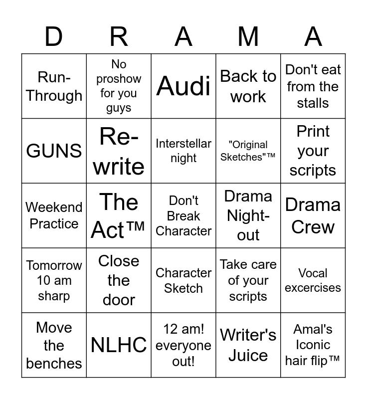 This bingo card has 1 images and 30 words: NLHC, From the Top™, The Act™, Niranchana's nose™, Run-Through, Audi, Re-write, Character Sketch, Drama Night-out, 12 am! everyone out!, Drama Crew, Don't Break Character, Writer's Juice, Amal's Iconic hair flip™, Print your scripts, First years, come to the front, Take care of your scripts, Tomorrow 10 am sharp, Close the door, Don't eat from the stalls, Weekend Practice, Louder!, No proshow for you guys, "Original Sketches"™, GUNS, Back to work, Vocal excercises, Move the benches, Interstellar night and KK.