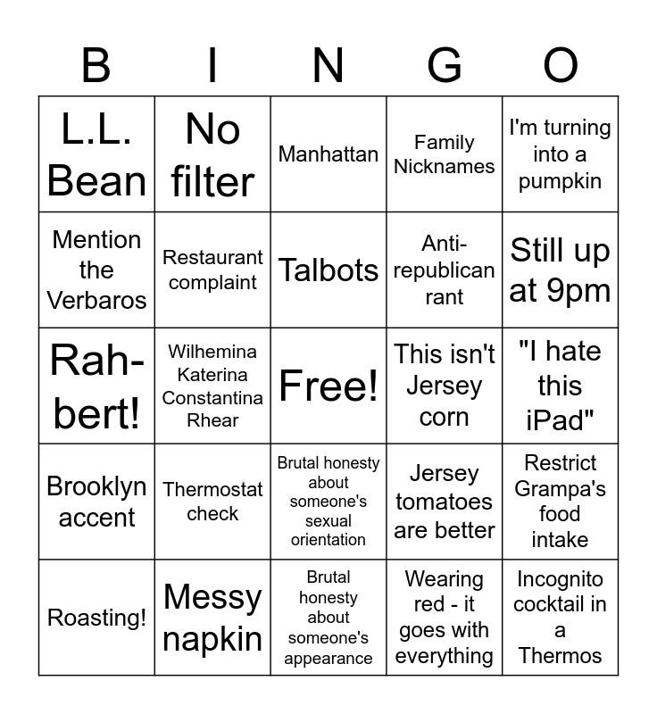 This bingo card has a free space and 29 words: Roasting!, Ya gotta eat a peck of dirt..., Wilhemina Katerina Constantina Rhear, Toozdee, L.L. Bean, Manhattan, Restaurant complaint, Thermostat check, This isn't Jersey corn, Messy napkin, "I hate this iPad", Incognito cocktail in a Thermos, Brutal honesty about someone's appearance, Wearing red - it goes with everything, Still up at 9pm, Anything critical of Trump, Brutal honesty about someone's sexual orientation, Brooklyn accent, I'm turning into a pumpkin, Rah- bert!, Jersey tomatoes are better, Spilled drink, Anti-republican rant, Mention the Verbaros, Family Nicknames, No filter, Restrict Grampa's food intake, Talbots and Mac Salad.