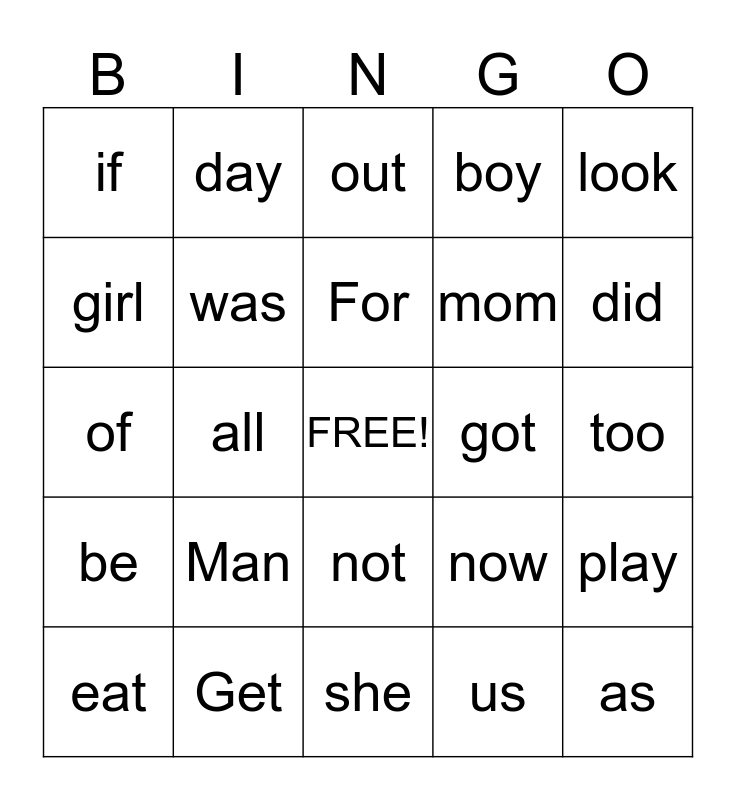 This bingo card has a free space and 24 words: Man, Get, For, eat, look, if, girl, day, got, not, mom, of, now, play, was, us, too, out, did, all, as, be, boy and she.