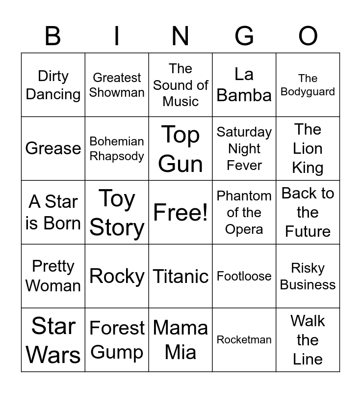 This bingo card has a free space and 24 words: Rocky, Forest Gump, Top Gun, Star Wars, The Bodyguard, Dirty Dancing, Grease, Greatest Showman, Phantom of the Opera, Titanic, Saturday Night Fever, A Star is Born, Footloose, Risky Business, Bohemian Rhapsody, Rocketman, Back to the Future, The Sound of Music, The Lion King, Toy Story, Walk the Line, Pretty Woman, La Bamba and Mama Mia.