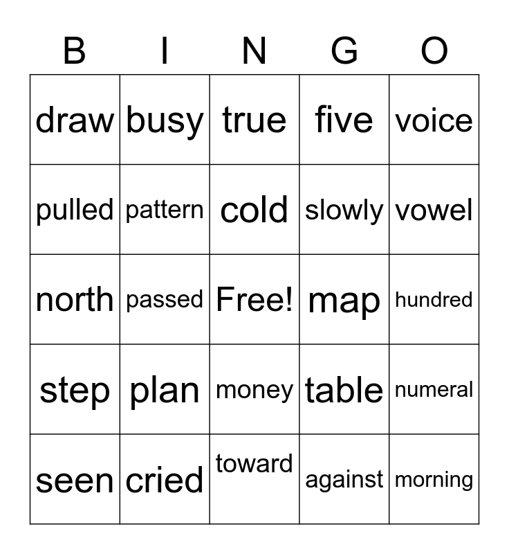 This bingo card has a free space and 24 words: plan, cried, cold, seen, voice, draw, pulled, busy, map, money, slowly, north, table, numeral, pattern, against, hundred, true, vowel, passed, morning, step, five and toward.