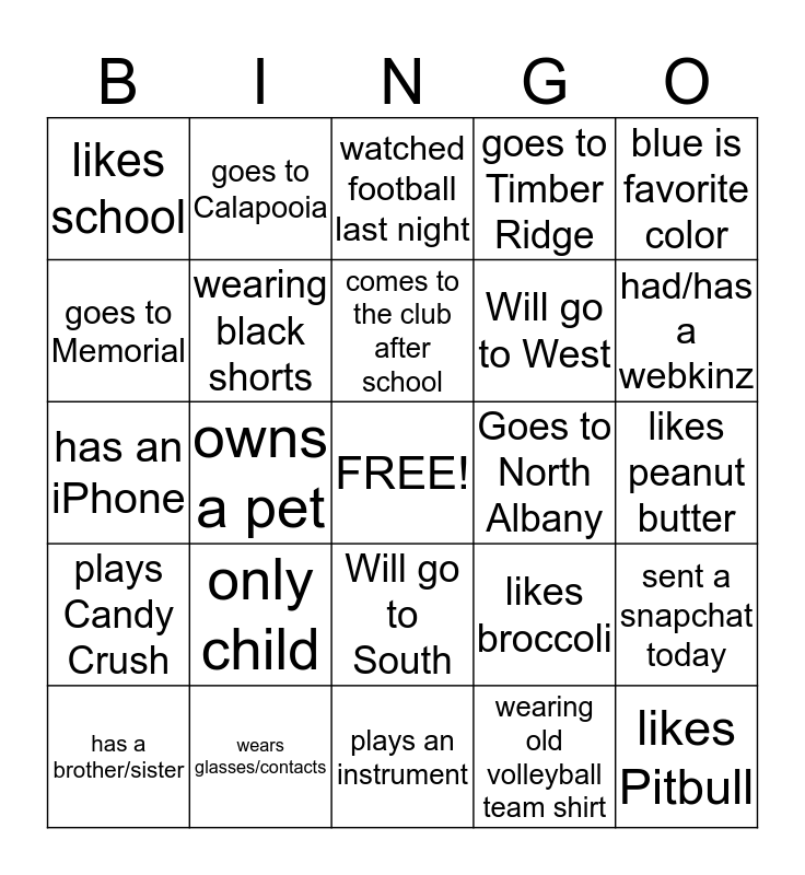 This bingo card has a free space and 24 words: only child, wears glasses/contacts, comes to the club after school, has a brother/sister, blue is favorite color, likes school, goes to Memorial, goes to Calapooia, Goes to North Albany, Will go to South, Will go to West, has an iPhone, likes broccoli, sent a snapchat today, wearing black shorts, wearing old volleyball team shirt, likes peanut butter, watched football last night, had/has a webkinz, owns a pet, likes Pitbull, plays Candy Crush, goes to Timber Ridge and plays an instrument.