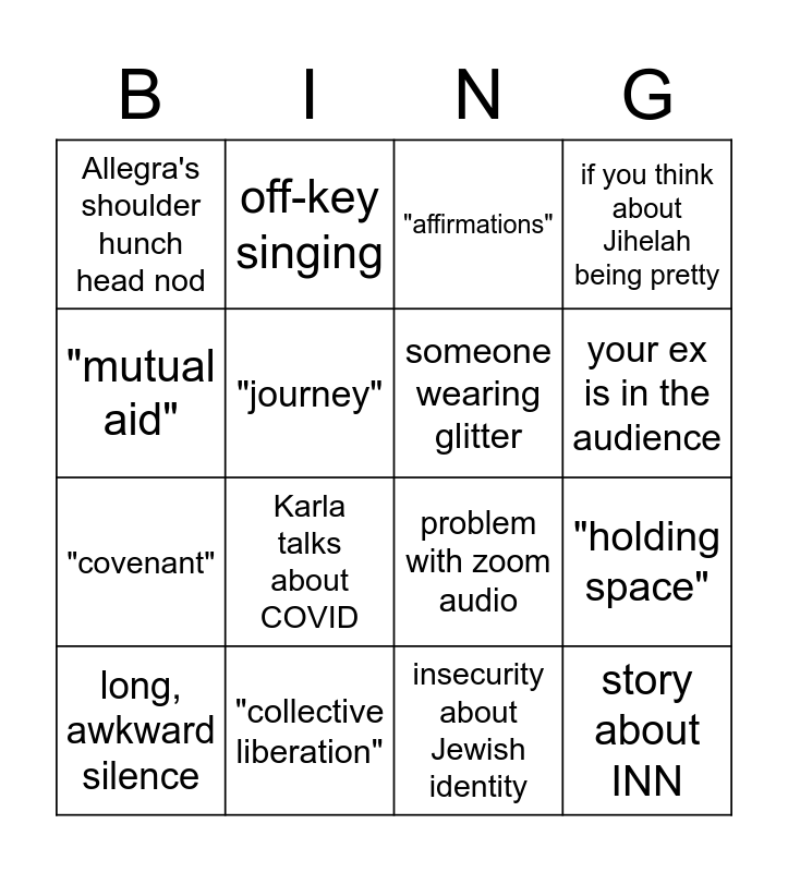 This bingo card has 16 words: "collective liberation", "holding space", "affirmations", Allegra's shoulder hunch head nod, "covenant", off-key singing, problem with zoom audio, insecurity about Jewish identity, "mutual aid", "journey", long, awkward silence, if you think about Jihelah being pretty, Karla talks about COVID, your ex is in the audience, someone wearing glitter and story about INN.